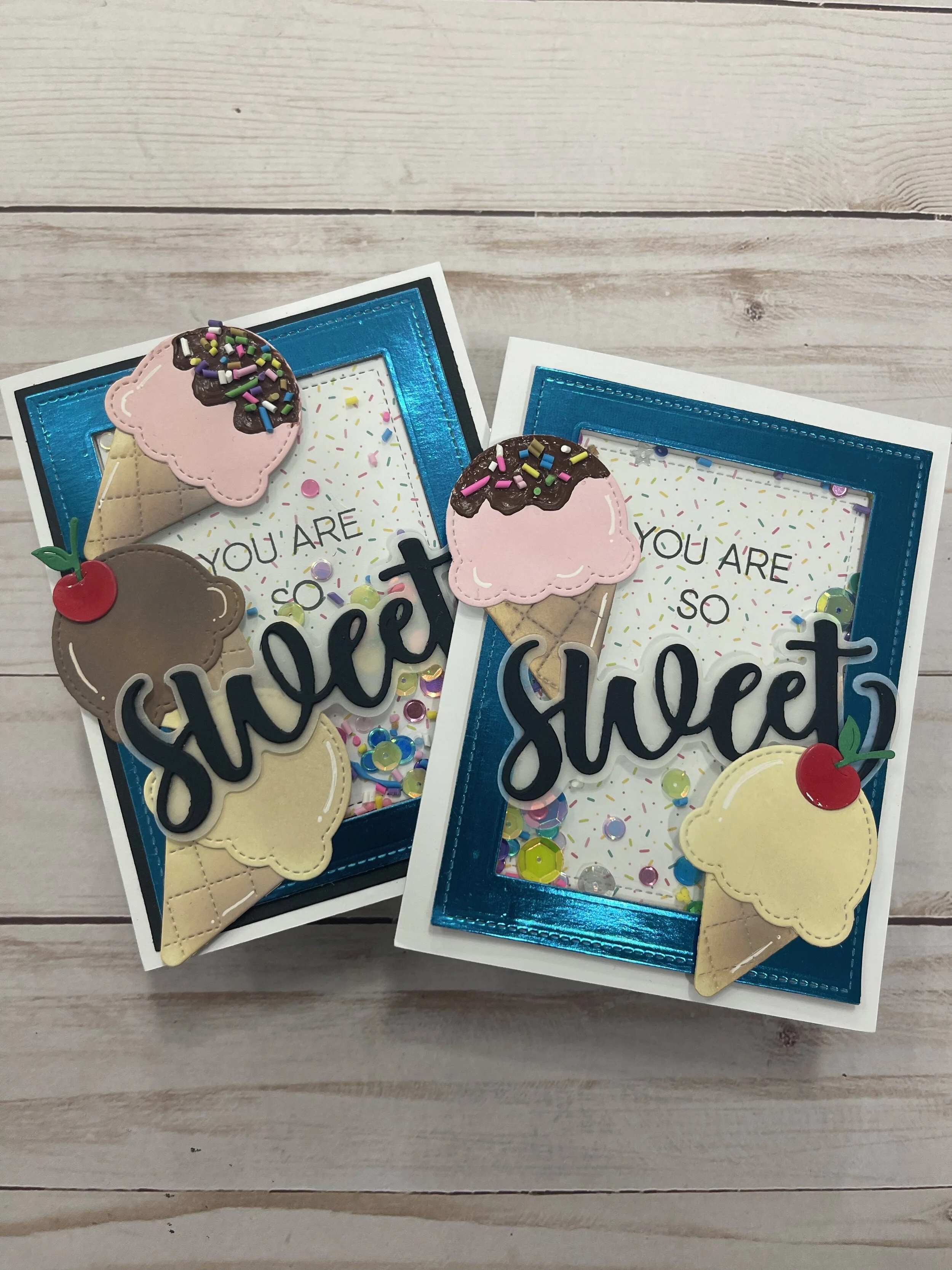 I hope you had a great day! Tis’ the season for fun in the sun, flip-flops, and ICE-CREAM!!!!! I went through my die stash and was inspired to create an ice-cream shaker card. I mean, who doesn’t love ice-cream with SPRINKLES!?!?!?! This card is an easy card to create, and is perfect for a birthday, or just because occasion.