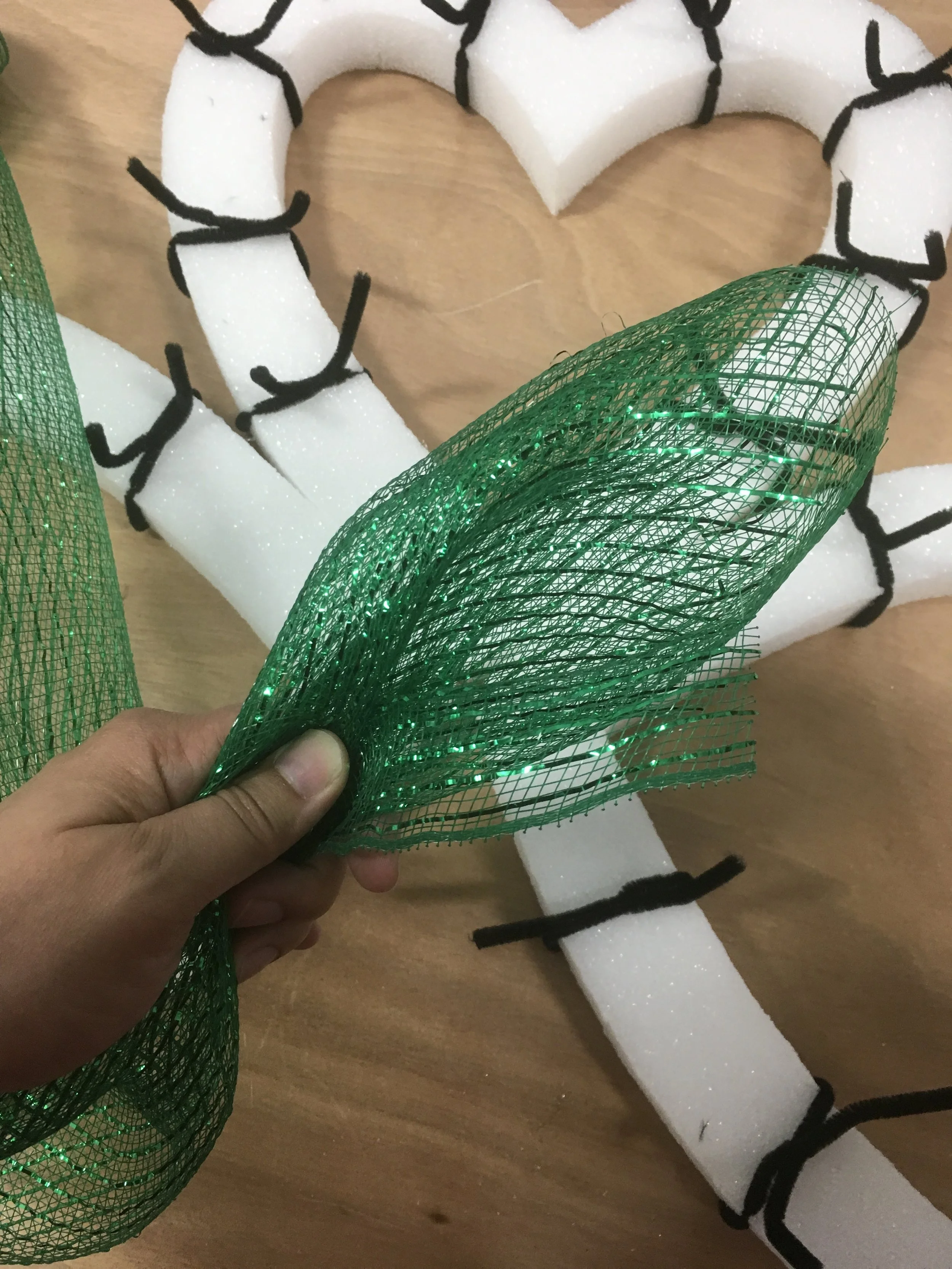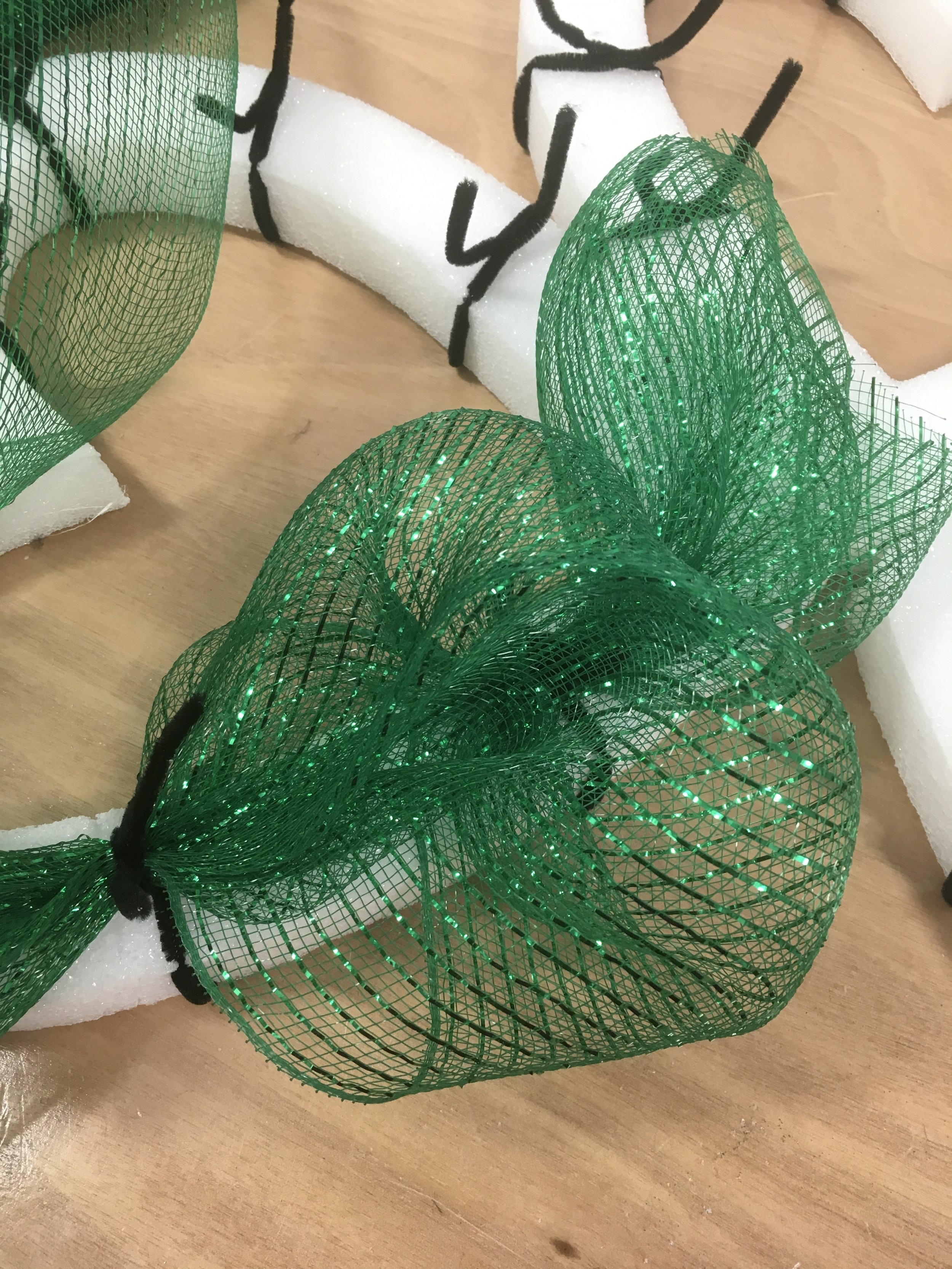Take about 8-10 inches of the mesh and gather it into a puff, then tie it with the next stem on the inside row of the wreath form. You can create different looks with the floral mesh depending on how you twist and puff the material. Continue this process until the entire wreath is filled.
