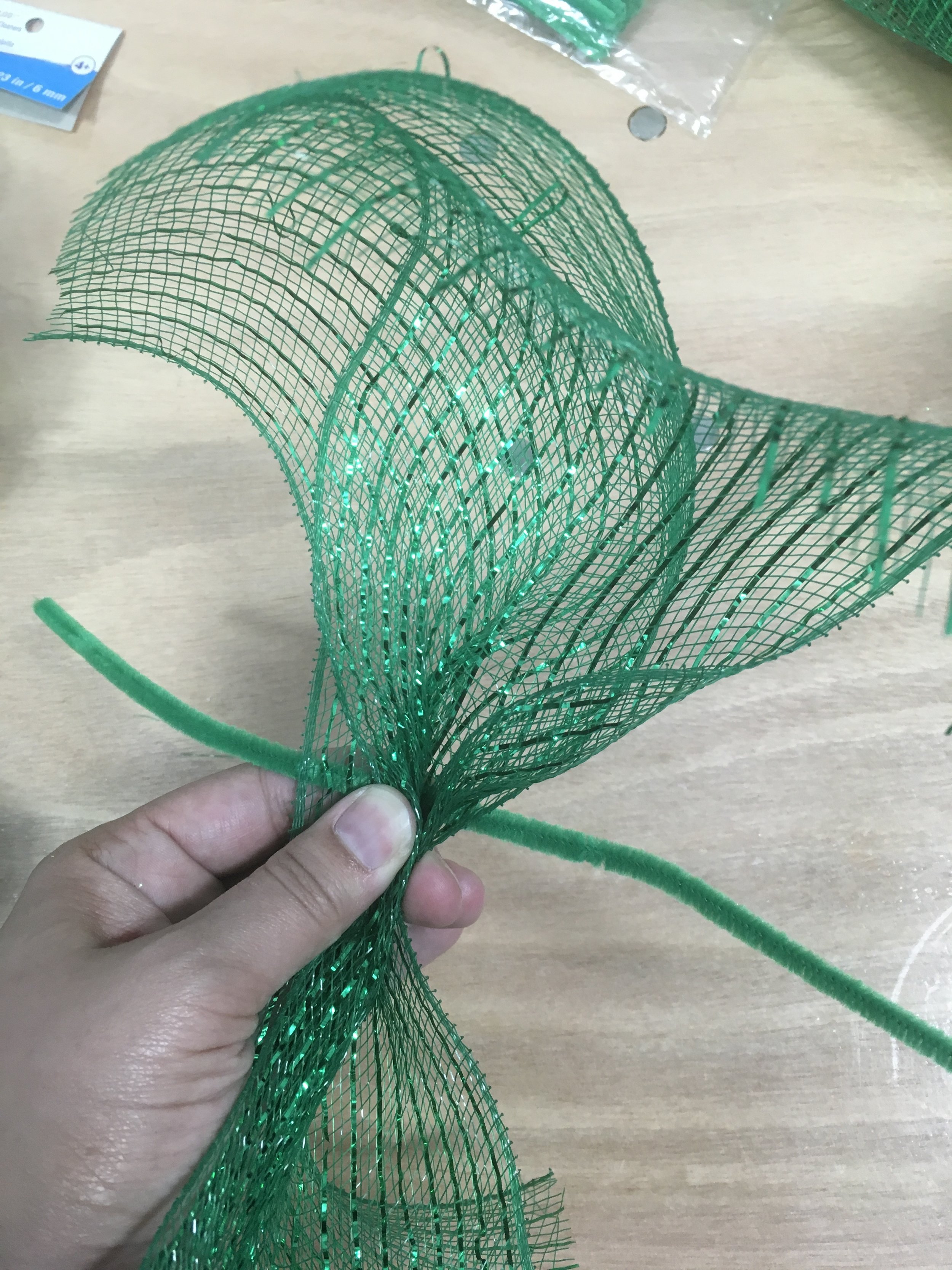 Gather the end of your mesh ribbon with your fingers. Then twist the mesh into one of the stems about 2-3 times to make sure it is tightly secured.